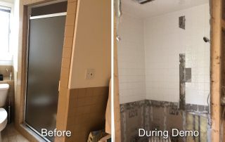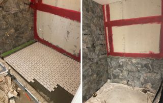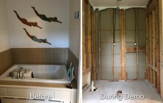 When the clients have a clear vision of what they want, it jumpstart the project. Merideth and her husband Bob were such a client. They were undaunted by the fact that their current “ridiculously impractical and dark” bathroom was tiled, with cabinetry built in. They wanted more space and light! The first order of business was to completely demolish the existing tiled shower, walls, and floor. The tub and radiator baseboard heat were removed.