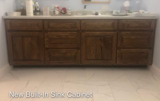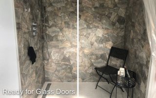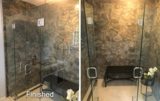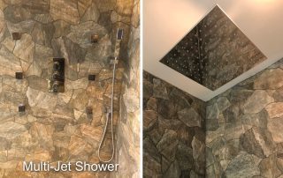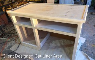 The contrast between the Italian marble style of the floor tiles and the rustic grotto appearance of the shower tiles, created a striking aesthetic. This was further accentuated with the addition of plants and wrought iron patio furnishing in the shower area. Near the completion of the project, a litter box enclosure, designed by Merideth was added to the room decor.