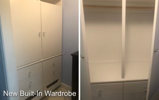 A built-in wardrobe and walnut sink cabinet was custom made to complete the furnishing.